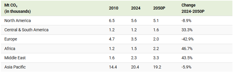 Përkundrazi, rajonet në zhvillim përballen me rritje të shpejtë të emetimeve. Afrika pritet të rritet nga 1.5 mijë Mt në vitin 2024 në 2.2 mijë Mt në vitin 2050, një zgjerim prej 46.7% i nxitur nga rritja demografike dhe industrializimi. Lindja e Mesme parashikohet të ndjekë një trajektore të ngjashme, duke u rritur me 43.5%, ndërsa Amerika Qendrore dhe Jugore me 33.3% deri në vitin 2050, pasi kërkesa për energji dhe urbanizimi vijojnë të rriten.