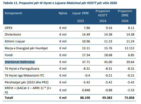 KOSTT ka paraqitur kërkesën për shërbime ndihmëse për vitin 2026 në shumën prej 45.00 milionë euro, por ZRrE ka propozuar një nivel prej 39.64 milionë euro.