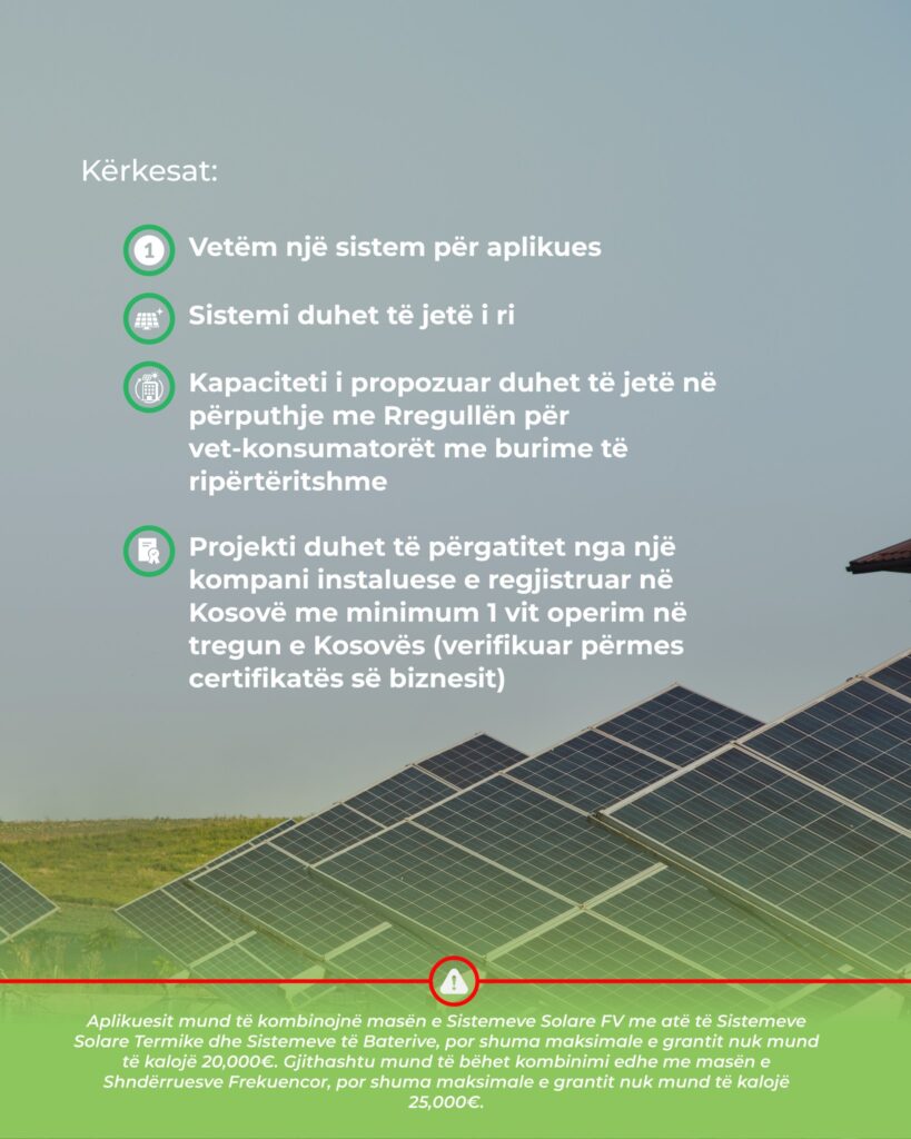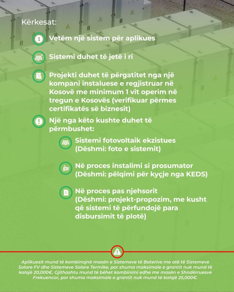 • Të jetë ndërmarrje mikro, e vogla ose e mesme (NMVM), apo të jetë ndërmarrje e madhe që përfitojn nga tarifat e rregulluara të energjisë elektrike (operon në treg të hapur);