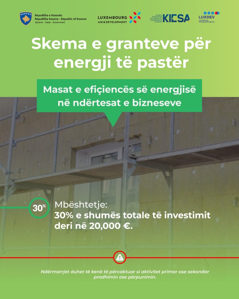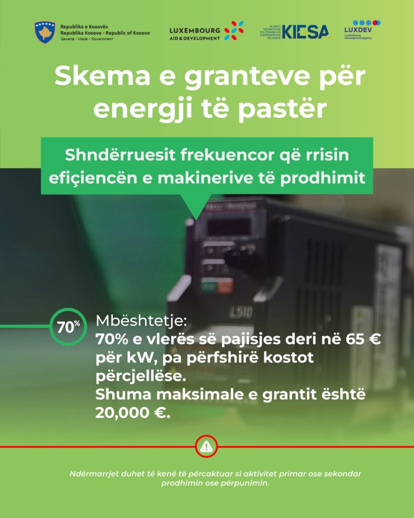 Mirëpo kjo skemë mbështetëse është e dizajnuar për bizneset prodhuese dhe përpunuese që duan të investojnë në teknologji të gjelbra, të rrisin efiçiencën e energjisë dhe të kontribuojnë në tranzicionin drejt energjisë së pastër.