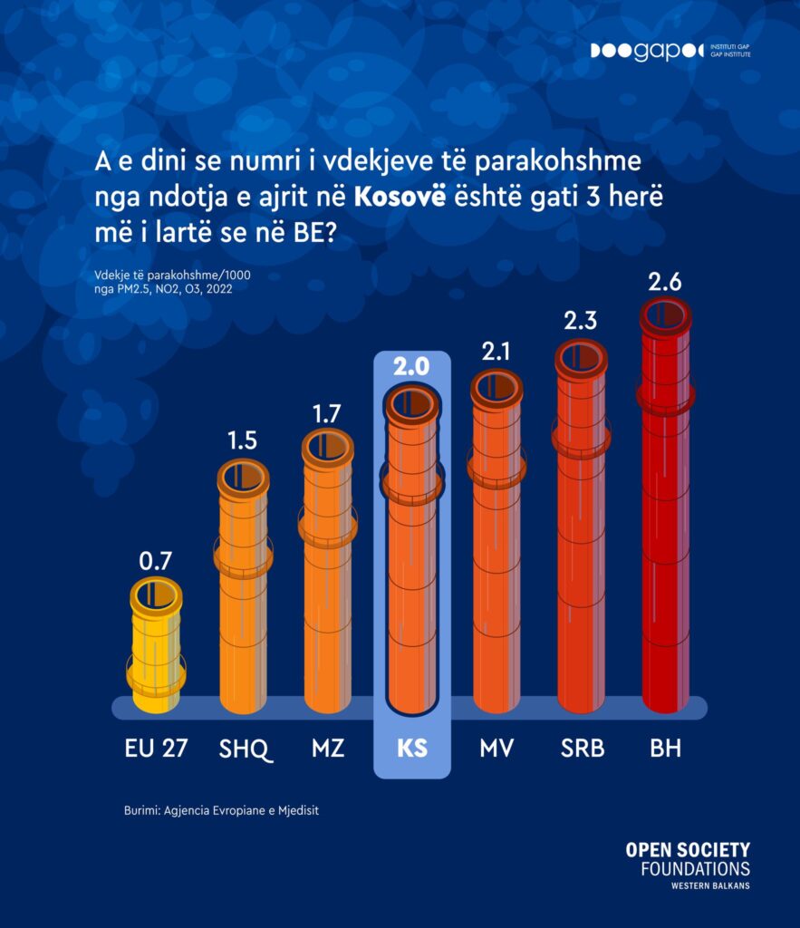 Energjia elektrike e prodhuar nga qymyri në vendet e Ballkanit Perëndimor vazhdon të ketë një kosto të fshehtë dhe të lartë për shëndetin publik. Vetëm në Kosovë, numri i vdekjeve të parakohshme që lidhen me ndotjen e ajrit është gati tri herë më i lartë se mesatarja në Bashkimin Evropian. Situata e ngjashme vërehet edhe në vendet tjera të rajonit.