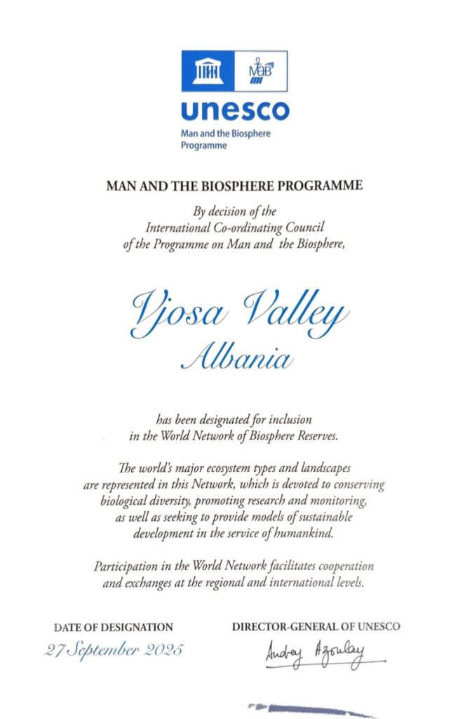 “Vjosa në UNESCO. Vjosa është përfshirë zyrtarisht në programin ‘Njeriu dhe Biosfera’ si pjesë e listës së trashëgimisë botërore”, shkruan kryeministri.