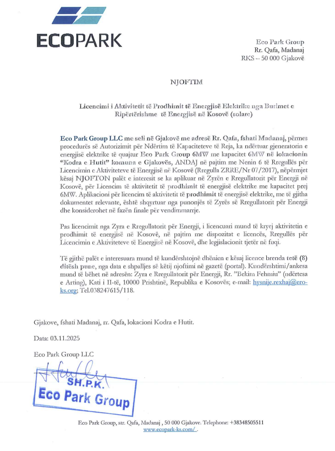 Sipas njoftimit zyrtar, Eco Park Group ka aplikuar në ZRrE për licencë të prodhimit të energjisë elektrike nga burimet e ripërtëritshme, në pajtim me Rregullën për Licencimin e Aktiviteteve të Energjisë në Kosovë (Z.RRE./Nr.07/2017).