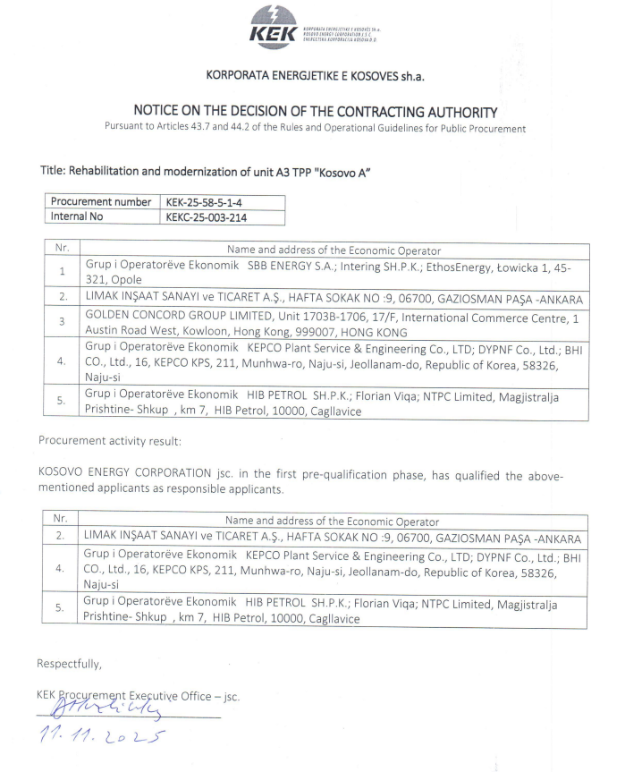 Ndërkohë, tash gati pas një viti, pas pezullimit të tij, KEK-u ka publikuar operatorët ekonomikë që kanë ofertuar për rehabilitimin dhe modernizimin e njësisë A3 në Termocentralin Kosova A.