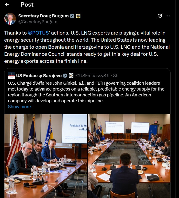 “Falë veprimeve të @POTUS, eksportet e LNG-së amerikane po luajnë një rol jetësor në sigurinë energjetike në të gjithë botën. Shtetet e Bashkuara tani po udhëheqin përpjekjen për të hapur Bosnjë-Hercegovinën për LNG-në amerikane dhe Këshilli Kombëtar i Dominimit të Energjisë është gati ta çojë këtë marrëveshje kyçe për eksportet e energjisë amerikane në vijën e finishit.” – shkruan Burgum në X.