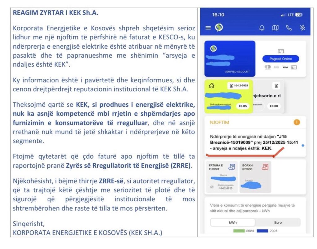 Në reagim, KEK thekson se ky informacion është i pasaktë dhe keqinformues. Si prodhues i energjisë elektrike, KEK nuk ka kompetencë mbi rrjetin e shpërndarjes apo furnizimin e konsumatorëve dhe nuk është përgjegjës për ndërprerjet e energjisë që shfaqen në faturat e KESCO-s.