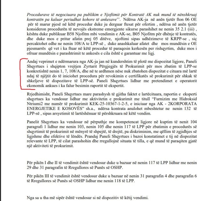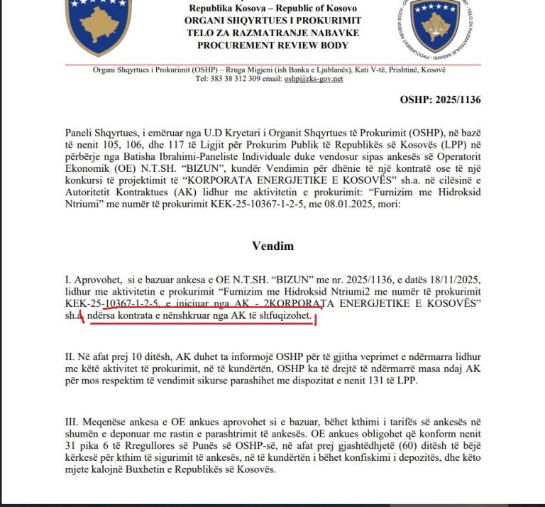 Organi Shqyrtues i Prokurimit (OSHP) ka marrë vendim lidhur me aktivitetin e prokurimit të Korporatës Energjetike të Kosovës (KEK) për “Furnizim me Hidroksid Natriumi”. Paneli Shqyrtues, ka aprovuar si të bazuar ankesën e operatorit ekonomik N.T.SH. “BIZUN” dhe ka vendosur që kontrata e nënshkruar nga autoriteti kontraktues të shfuqizohet. Vendimi, i nxjerrë nuk mbyllet vetëm me anulimin e kontratës. Ai shkon edhe më tej, duke e cilësuar rrjedhën e procedurës si në kundërshtim me Ligjin për Prokurim Publik, dhe duke i shqiptuar vërejtje zyrtare Zyrtarit Përgjegjës të Prokurimit me paralajmërim të hapur se, nëse shkeljet përsëriten, mund të iniciohet procedurë për revokimin e certifikatës së prokurimit.
