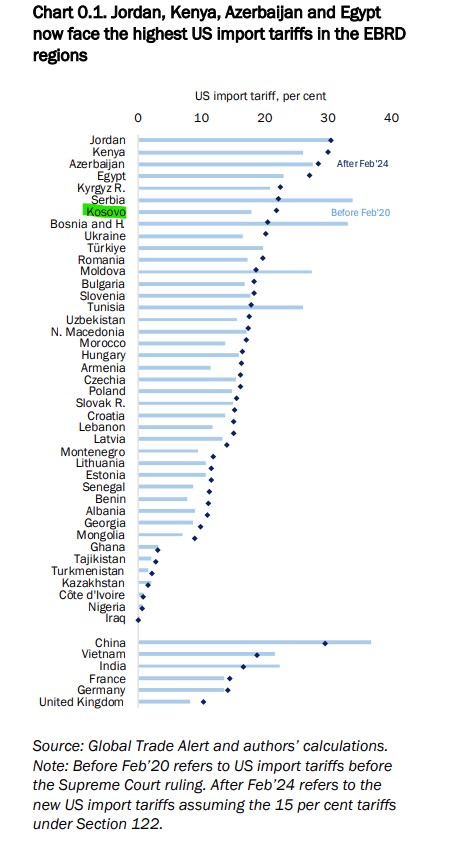 Shtetet e Bashkuara të Amerikës kanë vendosur një paketë të re tarifash prej 10 për qind. Sipas një raporti të publikuar më 26 shkurt nga Banka Evropiane për Rindërtim dhe Zhvillim (EBRD), Kosova renditet ndër vendet më të goditura nga këto tarifa në rajonin ku operon kjo bankë. Shqipëria ka një rritje me 2 pikë përqindje, por mbetet ndër shtetet me tarifat më t♪ ulëta.